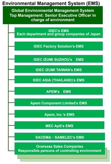 | ISO14001Management System Based on ISO14001Since the acquisition of ISO14001 certification of the international standards for environmental management in September 1997, IDEC has been engaged in efforts to contribute to the protection and maintenance of the global environment. Following the revision of ISO14001 in 2015, all the ten group companies in Japan and all overseas eight factories including APEM's head office have acquired certifications as below. Overseas sales companies conduct activities in compliance with the basic contents of ISO14001 based on the global EMS. | |
