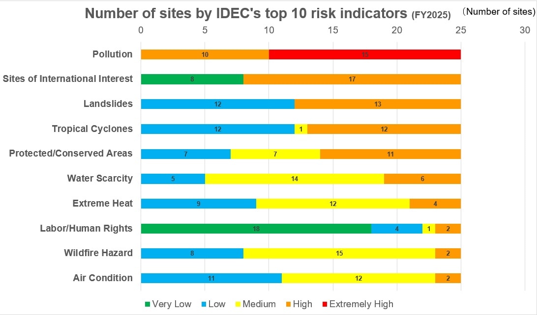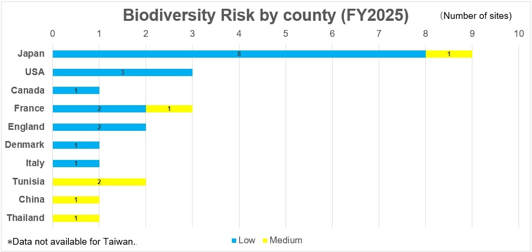 Analysis of Biodiversity RisksSince FY2024, we have conducted the analysis and assessment of IDEC group's biodiversity risks in order to define indexes that helps to study impacts on biodiversity by IDEC group's business activities and monitor biodiversity results. As an assessment tool, we adopt Biodiversity Risk Filter developed by World Wide Fund for Nature (WWF) to quantify biodiversity risks by country. In addition, we identify top 10 biodiversity risk indicators of of the whole group. The following graph shows the quantified results of the IDEC group's biodiversity risks based on the risk assessments of each site by country. Overall assessment of 24 sites in the world were rated as low or medium risks, and there was no site with high biodiversity risk. | ||