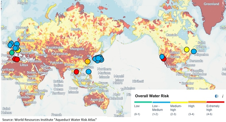 Analysis of Water StressWater resource is important for business continuity of the IDEC Group as well as for all the livings in the global environment. On the other hand, due to the impact of climate change such as global warming, water risks including water shortage, concentrated heavy rains, and floods are increasing every year. For the purpose of controlling water resources properly and utilizing assessment results of water risks to business continuity, we have assessed water risks of 25 sites including manufacturing, development of all IDEC group in addition to head quarter since FY2024. As an assessment tool, we adopted Aqueduct Water Risk Atlas 4.0 developed by World Resources Institute to quantity risks of water stress, riverline flood, coastal flood, and drought of each site. In addition, we investigated the amount of water intake per site. The following is the world map that shows Aqueduct overall water risk per each IDEC site. Among 24 sites, four sites (each one site in USA and Thailand and two sites in Tunisia) were assessed as extremely high water risk, and one site in China was assessed as high water risk. There was no significant change compared to last year's results. | |