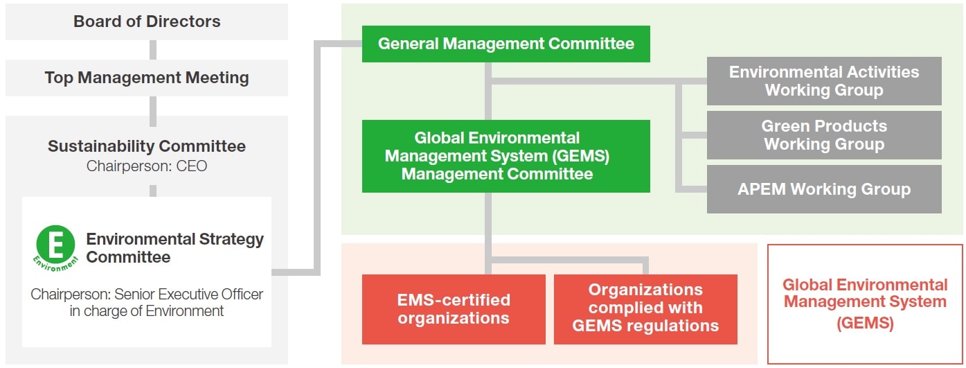 The Environmental Strategy Committee is composed of employees from various departments and meets bimonthly under direction by the Senior Executive Officer in charge of the Environment. Decisions made by the Environmental Strategy Committee are discussed by the Sustainability Committee, reported to the Top Management Meeting for approval, then reported to the Board of Directors for final approval.