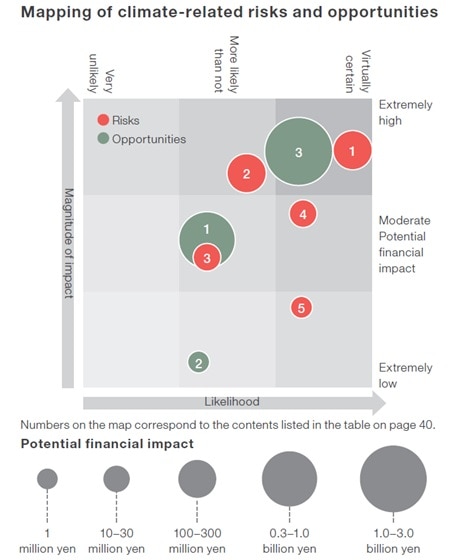 Next, we calculated the probability of occurrence, degree of impact, and potential financial impact for each risk and opportunity item, and updated our climate-related risk and opportunity map. Details summarizing the potential financial impacts of risks and opportunities and measures to address them is scheduled to be disclosed later.