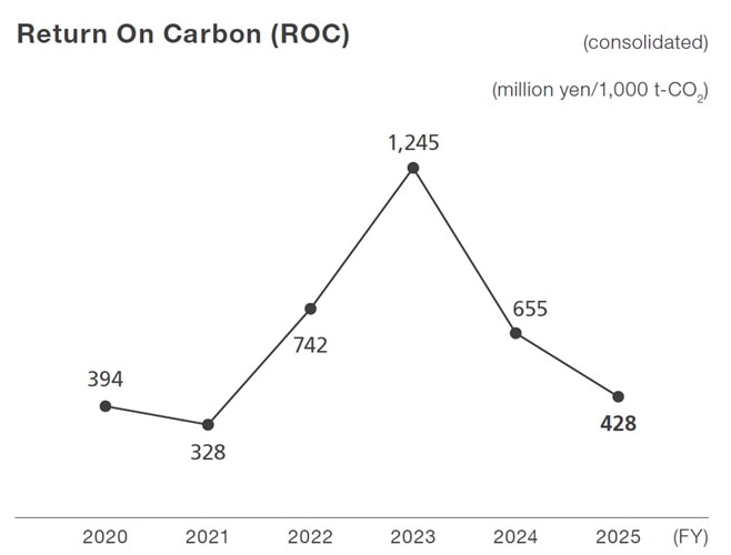 With the Performance Share Units (PSUs) introduced into the executive compensation system in FY2024, approximately 10% of compensation may be allocated to directors and executive officers in the form of common stock, with non-financial indicators being used in the calculation of PSUs. Our return on carbon (ROC) profit ratio, which indicates how much CO2 was reduced and how efficiently profits were earned, has continued to decline in line with the decrease in operating profit.