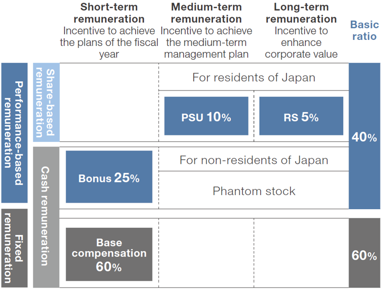 The ratio of each type of remuneration for the Company’s directors (excl. outside directors and directors who are Audit and Supervisory Committee Members) shall be set at base remuneration, bonus, PSU and RS = 60:25:10:5, with reference to other companies in the same industry and of the same scale, and in consideration of the level of salaries, social conditions, etc., of the Company’s employees (This shall be the standard that serves as a guideline for achieving 100% of the performance targets).